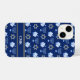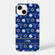 Hermoso Hanukkah iPhone 14 funda de azul bonito con un fresco patrón de estrella del judaísmo, dreidel para divertidos juegos de Chanukah, y la menorah judía. Personalizar con su monograma en blanco entre las líneas doradas.