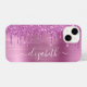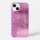 Estuche para iPhone personalizado, elegante y giratorio, con purpurina de imitación rosada sobre fondo metálico rosa falso. Personalice su nombre en un elegante guión en blanco y a la moda con cambios.