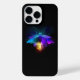 Luciérnagas mecánicas antiguas con bombilla de luz y finas alas brillan naranja, violeta, turquesa sobre fondo negro. Estilo Steampunk.
