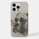 Protege tu iPhone Pro Max con estilo artístico. Esta funda presenta un boceto a lápiz detallado de un perro Boxer con una mariposa en su nariz, perfecto para los amantes de los perros que aprecian el diseño elegante e inspirado en la naturaleza.