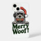 Este diseño cuenta con un perro negro y blanco tambaleante, posiblemente un Schnauzer, que lleva un sombrero de Santa Claus festivo. El perro está mirando por un borde con el texto "¡Merry Woof!" escrito en verde debajo. La textura de piel detallada y los ojos expresivos del perro añaden encanto, mientras que el diseño general transmite un tema festivo, combinando elementos de alegría de los Navidades con la mascota
