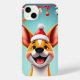 Perro de estilo personalizado con cara expresiva y alegre. El perro está sentado en un ambiente festivo, con un sombrero de Santa Claus rojo adornado con una pompa blanca esponjosa. Su piel es predominantemente naranja con acentos blancos, lo que le da un aspecto alegre. Alrededor del perro hay coloridas decoraciones navideñas, como vibrantes árboles navideños con ramas verdes onduladas, adornados con adornos rojos y blancos. También hay regalos envueltos en varios colores, colocados sobre un fondo suave y nevado. Una hilera de adornos lúdicos cuelgan sobre el lugar, con figuras animales y decoraciones de temática Navidad que realzan el ambiente festivo. El conjunto de la imagen es alegre y festivo, evocando una sensación de alegría festiva.