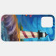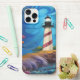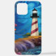 Hermoso faro de rayas rojas y blancas sobre un rocoso en el exterior rodeado de flores y agua azul/cielo Arte de IA creado por minx267