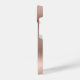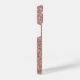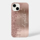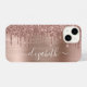 Estuche para iPhone personalizado, elegante y giratorio, con purpurina de imitación de oro rosa goteando sobre un fondo metálico de imitación de oro rosa. Personalice su nombre en un elegante guión en blanco y a la moda con cambios.