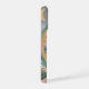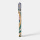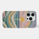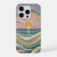 This vibrant, illustrative piece combines nautical scenery with mystical celestial symbols. At its center, a large circular window frames a tranquil sunrise or sunset over rolling ocean waves, rendered in a soothing palette of teal, seafoam, and lavender. Outside this frame, lush tropical foliage and palm fronds anchor the foreground, while the upper sky transition into a twilight scene featuring a golden crescent moon and shimmering stars. The artwork utilizes a mix of flat graphic shapes and soft watercolor textures, creating a peaceful, dreamlike coastal atmosphere that feels both modern and mythical.