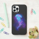 Gran medusa azul, de dibujo artístico, brillante y brillante, con largos tentáculos sobre fondo negro con bioluminiscencia violeta. Luminosas medusas.