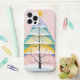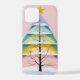 A vibrant, stylized composition depicting a Christmas tree in an abstract, layered landscape. The artwork features a distinct, dark central tree trunk and bare, snow-dusted branches reaching out across horizontal, triangular planes of color. These layers, rendered in soft pastel hues of pink, pale lavender, teal, and gold, suggest snow-covered tiers or an ethereal mountain range. A bright, golden, five-pointed star crowns the apex. The surface has a rich, textural quality, as if painted with thick paste or gouache. Gold accents highlight small, glowing spheres scattered across the branches and within the colorful layers, suggesting festive ornaments or winter light. The overall mood is cheerful, modern, and serene.