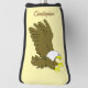 This eagle design golf club head cover is an accessory that you slide over the head of a golf club for protection against knocks whilst sitting in your golf bag. Made out of polyester, cotton, and marine vinyl with a choice of different piping colours. You can customise this golf club head cover with any text. Should you require any help with customising then contact us through the message link on this page. Bald eagle design golf club head cover.