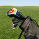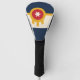 Cubierta de cabezal de golf con un diseño con la bandera de Tulsa, Oklahoma. Bandera beige y azul marino con un escudo Osage dorado que contiene un círculo rojo y una estrella beige de seis puntas