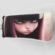 Un lindo y enfadado chica rockero de punk. Tiene bangs de corte limpio, pelo negro con ramas rosas. Ella tiene una cara pusilánime. Ella tiene un maquillaje de ojos oscuros y ojos verdes. El estilo Art es una mezcla de anime y 3d.
