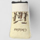 Esta personalizado cubierta de club de golf para sus empujadores tiene dos gatos rayados marrones caminando en la nieve con dos gatitos todos con arcos alrededor de su cuello llevando paraguas en un fondo amarillo claro. Personalizar tu nombre con la plantilla.