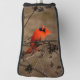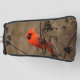 Asombroso pájaro rojo en las ramas de un árbol muerto o caído con hojas marrones. El fondo hace que el rojo intenso de las plumas de los pájaros destaque y se pop.