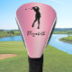 This custom ladies personalized golf head cover features a lady golfer silhouette with a customizable name on a pink metallic look background. It's a stylish, cute gift for a golfer. It's a useful present for your mom, sister, grandma, or any lady whose hobby is playing golf.