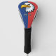 Esta cubierta personalizada de cabeza de golf presenta un diseño de cabeza de águila personalizado determinado con un fondo azul y rojo vibrante.