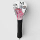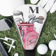 This cute modern golf head cover features the top part of a pink golf bag with clubs sticking out, creating a fun and stylish look. A single initial monogram appears at the top right for a personalized touch, keeping the design simple and chic. The soft watercolor style and pink tones make it perfect for the lady golfer in your life. Ideal as a thoughtful gift for Christmas, birthdays, Mother’s Day, or any special occasion.