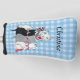 Esta personalizado cubierta de club de golf para sus putters tiene tres pequeños gatitos de colores negros, blancos y grises con su gato blanco y sus arcos rosas sobre un fondo de manta azul y blanca. Personalizar tu nombre con la plantilla.