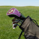 A la luz de una luna llena con un halo rojo y morado, un hombre de guerra marrón sangriento con colmillos afilados y aterradores. Según el folklore, un hombre lobo, o licantropo, es un humano con la capacidad de dar forma a un lobo durante la noche de luna llena. La mayor parte de la ficción moderna dice que las balas de plata o las armas de plata son la única manera de matar a los hombres lobos. El patrón de esta cubierta de conductor de golf es nuestro diseño de balas de plata con fondo morado. Un regalo perfecto para ese golfista que es un animal en el campo de golf, o el golfista amante de las películas de terror.