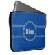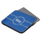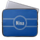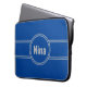 Puede agregar un nombre u otro texto al centro del manguito. Dos círculos grises rodean el texto. La manga del portátil es azul profundo. El texto es gris.