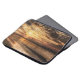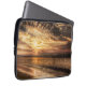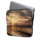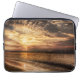 Impresionante fotografía paisajística del amanecer sobre una playa con un dramático cielo nublado en contraste con el agua tranquila.