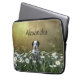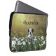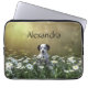 Un adorable cachorro dálmata blanco y negro se sienta tranquilamente en un campo de margaritas blancas.