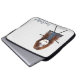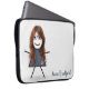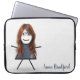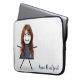 Pegue chica con anteojos azules, pelo, vestido azul denim y nombre personal sobre fondo blanco suave texturizado.