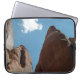 En el Parque Nacional de los Arcos, cerca de Moab, Utah, las aletas de un par de impresionantes aletas de arenisca crean un borde incierto al cielo azul. El sol golpea las aletas a la izquierda, dejando a los de la derecha a la sombra. Enmarcado por la V principal creada por las formaciones de entrada de piedra arenisca, una nube de algodón toca la parte superior de la imagen. 35 mm, fotografía a color. Copyright © 2004 Claire E. Skinner. Todos Los Derechos Reservados.