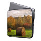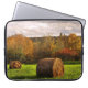 Esta manga del ordenador portátil de la fotografía de la bella arte presenta un paisaje precioso del otoño en colores estacionales del follaje de otoño de rojo, de anaranjado, de amarillo, de marrón y de verde. Una tormenta ha pasado y el sol se está rompiendo a través de las nubes sobre un campo segado con las balas redondas de heno.