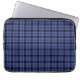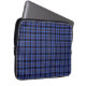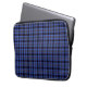 Modern plaid pattern laptop sleeve in dark blue with black and white accents.