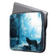 Lobo negro parado solo en las sombras de un bosque oscuro. El entorno natural está iluminado por un sol brillante que brilla por los árboles con una luz azul y helada.