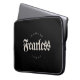 Manga de portátil cristiana con escritura gótica gris claro sobre fondo negro. El elemento perfecto para mantener tu portátil a salvo. Verso de la Biblia: En Dios no tengo miedo 2 Tim 1:9