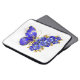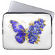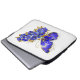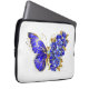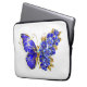 Joyería, azul, zafiro, mariposa floral brillante con ala decorada con flores azules y preciosas con hojas de oro sobre fondo blanco.
