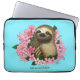 Una linda pereza sentada entre flores rosadas sobre un fondo azul.