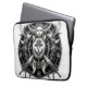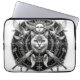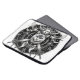 La imagen es un ilustracion detallado y místico centrado alrededor de la cara de un gato con ojos azules llamativos. La cara del gato está rodeada de elementos intrincados y simbólicos, dándole un aura de poder y sabiduría. Encima de la cabeza del gato hay un sol radiante con una cara humana que añade una cualidad celeste y divina a la escena. A ambos lados del gato hay dos palomas huyendo, que representan paz y pureza. Toda la composición está enmarcada por elementos circulares, mecánicos y celestes, como engranajes, cadenas y estrellas, que evocan una sensación de equilibrio y misterio cósmico. Dos espadas ornamentadas cruzan bajo la cara del gato, simbolizando protección y fuerza. Estas espadas están adornadas con elementos decorativos y se complementan con alas, lo que realza aún más la temática mística de la imagen. El estilo general de la imagen es monocromático, con detalles finos y una mezcla de patrones orgánicos y geométricos que crean un sentido de armonía y poder. La combinación de estos elementos sugiere temas como la tutela, la perspicacia espiritual y el orden cósmico, en los que el gato es una figura central, casi divina, en este intrincado tableau de otro mundo.