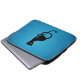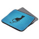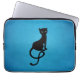 La manga elegante del ordenador portátil del gato azul con un ilustracion hermoso de un gato negro malvado gracioso con brillar intensamente observa en un fondo azul vibrante texturizado grunge.