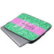 El purpurina verde y rosa brillante y brillante deslumbra el nombre del monograma blanco y la manga inicial del portátil. Su nombre personalizado y su monograma están escritos en un guión elegante con letras a mano con un fondo rosado. Puede cambiar el color del texto y el estilo y el tamaño del tipo de letra mediante la opción personalizar. ¡Un regalo perfecto de cumpleaños o Navidades!