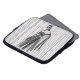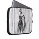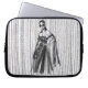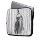 Un ilustracion de diseño en blanco y negro con una mujer encapuchada y un vestido de flores intrincadas con adornos florales y una capa que fluye. El fondo tiene una sorprendente textura vertical de línea, añadiendo un sentido de profundidad y movimiento