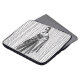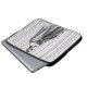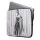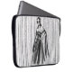 Un ilustracion de diseño en blanco y negro con una mujer encapuchada y un vestido de flores intrincadas con adornos florales y una capa que fluye. El fondo tiene una sorprendente textura vertical de línea, añadiendo un sentido de profundidad y movimiento