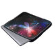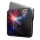Glowing, flying, red dragonfly, with transparent, detailed wings on dark, nocturnal, luminous background with tropical plants and fireflies. Red dragonfly.