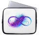 Símbolo infinito con una hermosa pluma pintada de color violeta y azul brillante sobre fondo blanco.
