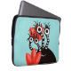 Manga de portátil monstruo con una criatura personalizado negra con cuatro ojos en los tallos rayados blancos y negros largos sonriendo, escondidos en tulipanes rojos abstractos.