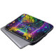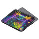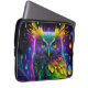 Fondo negro con goteo multicolor y motas. Sólido negro en la parte posterior. El búho está en un arcoiris de colores. plumas naranjas, amarillas, verdes, verde azuladas, rosadas y azules y sentadas en una rama de árbol.