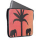 Esta manga de computadora está diseñada con mi representación de dos elefantes y una silueta de palmera colocada sobre un fondo de puesta de sol naranja.