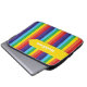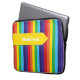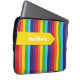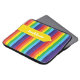 Esta manga de portátil brillante con rayas arco iris tiene una cinta de bandera amarilla con detalles de cosido blancos en la parte superior. Se personaliza con un nombre o cualquier texto que desee agregar.