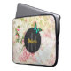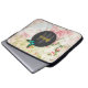 Una manga de portátil peronalizada con un nombre y un primer monograma. Diseñado con una mariposa verde y elegante. En el centro, un cuadro circular negro cubrió por encima un patrón de collage vintage con rosas rosadas densas y hojas de oro verde con un aspecto anticuado y poco convencional.