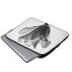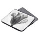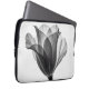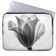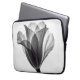 A close-up, monochrome photograph showcases a tulip flower against a bright white background. The flower's petals are delicately rendered, with visible veins adding texture. The image captures the flower from a low angle, emphasizing its upward reach. The stem is slender and dark, contrasting with the lighter petals. The overall mood is serene and elegant, highlighting the flower's natural beauty.