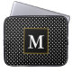 Un gran monograma blanco es un cuadrado negro con un borde de oro falso. Los puntos de polka blancos están en esta manga negra de un portátil.