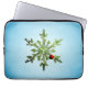 Navidades manga portátil con un collage que representa un hermoso copo de nieve hecho de ramas de pino. Una bola de Navidades rojos está colgada en una de las ramas de pino.