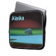 Un oso polar deambula por el hielo durante la larga noche polar; las auroras boreales en rojo y verde brillan a lo lejos. También aparece el texto que dice "Alaska" en azul brillante y blanco.