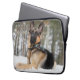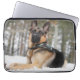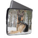 Perro pastor alemán posando en la nieve con una bandana de color camoflaug.