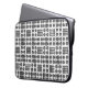 Una manga para portátiles Neoprene de muy moda, con un patrón de motivos tradicionales de tapiz galés en negro sobre fondo blanco.